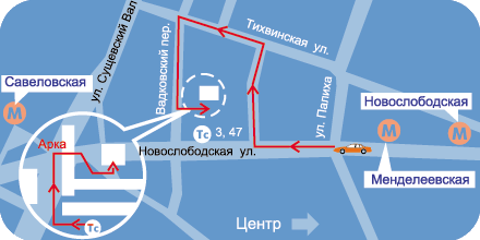 или "Менделеевская", тролл. № 3 или № 47 до ост. "Вадковский переулок" (от центра